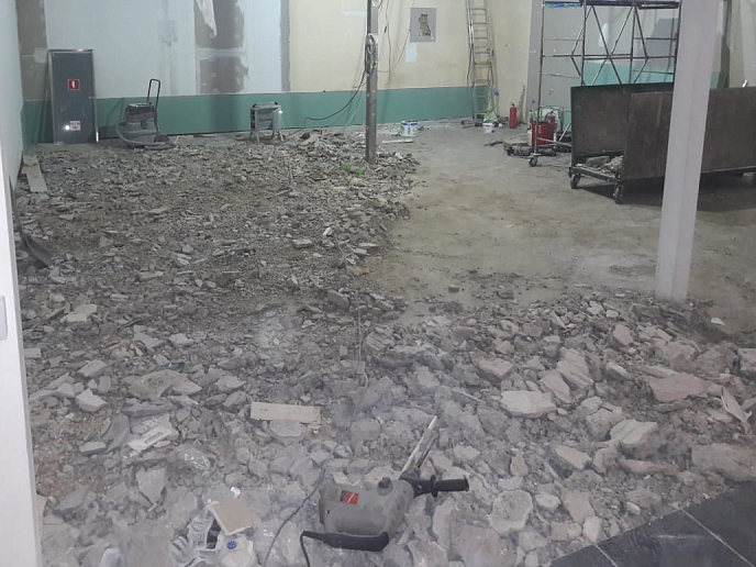 На втором этапе были организованы работы по демонтажу инженерных конструкций, входной группы, панелей стен, перекрытий, перегородок, вентиляционных блоков, напольных покрытий и потолка.
