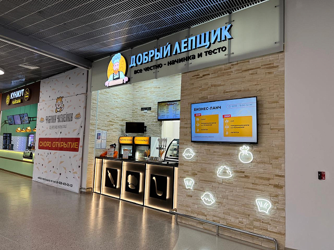Трудности заключались в совмещении элементов фасада с фризом торгового центра, подключении систем вентиляции к системам ТЦ, переносе вводного щита ТЦ по помещению.