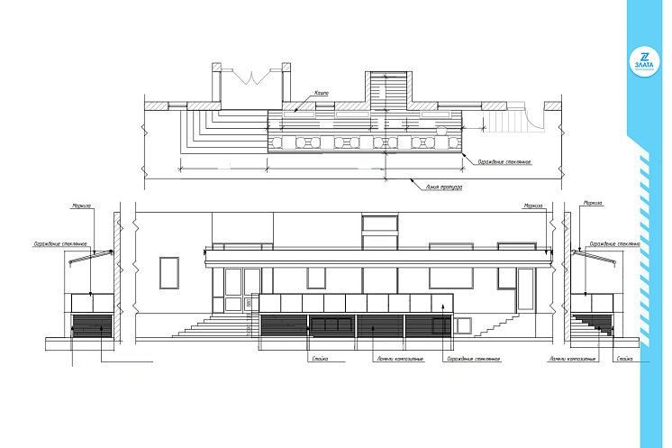 По запросу заказчика специалистами ГК “ЗЛАТА” разработан проект конструктивного элемента фасада строения, который предусматривает создание дополнительных мест и при этом сохраняет фирменный стиль организации. Данный документ послужил основой для последующего согласования архитектурного решения экстерьера.