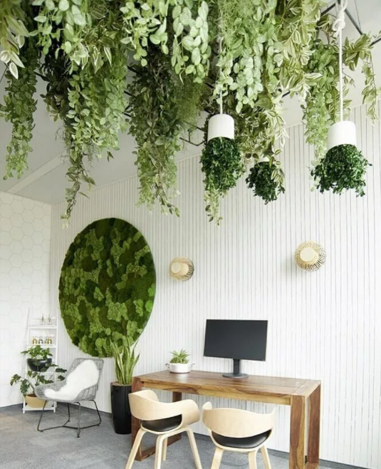 Во многих минималистских офисах и коммерческих помещениях с чистым и трезвым оформлением используются вертикальные стены из мхов и другой зелени для придания цвета и естественности помещению или пространству.