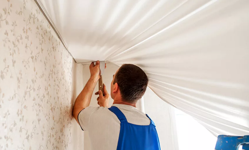 При ремонте натяжного потолка края пореза обычно заклеивают скотчем, чтобы не допустить расползание краев пореза. Маскировка шва может быть любой: от вентиляционной фальшрешетки до потолочного светильника или простой аппликации. В этом случае удаляется поврежденный участок полотна, материал нагревается и растягивается в угол помещения, чтобы вернуть потолку первоначальный вид. С провисанием потолка ситуация другая — при наличии малейшего провисания необходимо провести полную перетяжку полотна